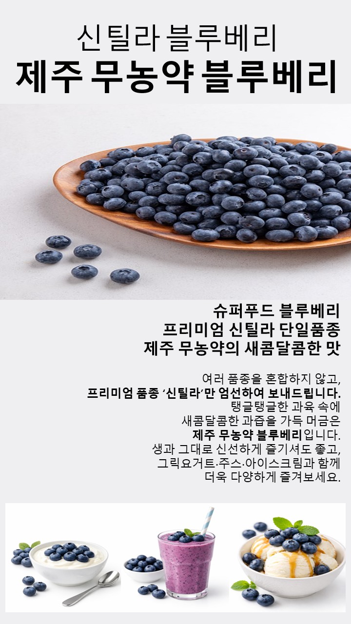 | | | 물품특징 | | 친환경 농법으로 정성껏 재배한 블루베리로 무농약 사양으로 공급되는 물품입니다. | | | 이용방법 | | ■ 블루베리 스무디 만들기(블루베리 120g 기준) - 재료 : 플레인 요구르트 한 개, 우유 약간(묽은 맛이 좋으면 50ml), 꿀 2Ts, 얼음 - 만들기 1) 블루베리와 요구르트, 꿀, 우유, 얼음과 함께 믹서기에 갈아 주세요. 2) 간 스무디를 예쁜 컵에 넣어 주세요. 3) 블루베리 생과를 살짝 잘라 위에 올려 주세요.