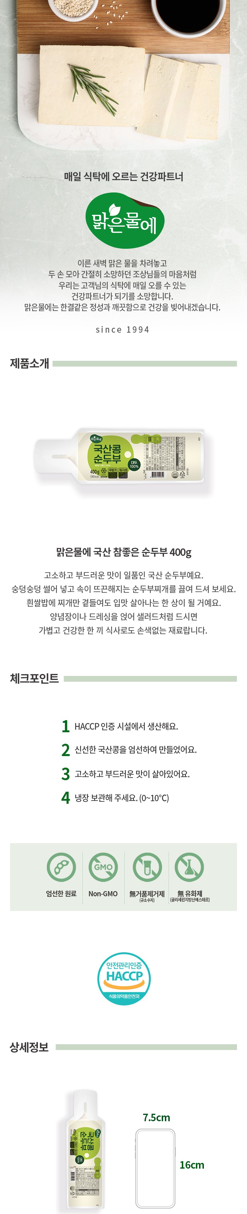 | | 물품특징 | | 1. 1등급 이상의 국산콩만 사용하여 더욱 고소한 맛이 살아 있습니다. 2. 탱글탱글 부드러운 순두부는 그대로 먹을 수 있으며 찌개나 샐러드를 만들어 먹어도 좋습니다. 3. 유화제, 거품제거제를 사용하지 않고 건강하게 만들었습니다. | | 이용방법 | | 1. 순두부찌개 물 또는 육수에 다진 마늘, 고춧가루, 간장을 넣고 끓입니다. 해산물, 돼지고기, 버섯, 야채 등 원하는 재료를 넣어 끓입니다. 순두부를 넣고 2~3분만 더 끓여 부드럽게 즐깁니다.