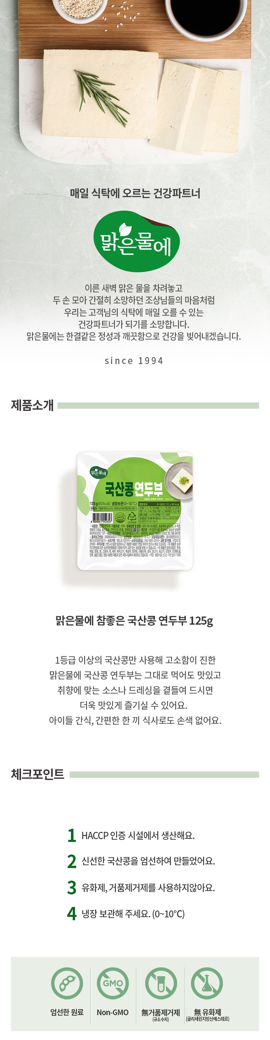 | | 공급시기 | | 상시공급 | | 식품유형 | | 두부 | | 생산지 | | 1. 생산지명 : ㈜맑은식품 2. 주소 : 충청북도 음성군 삼성면 하이텍산단로 137 | | 원부재료 | | 대두 100%(국산) | | 중량설명 | | 125g | | 포장재질 | | 폴리에틸렌(리드), 폴리프로필렌(용기) | | 소비기한 | | 제조일로부터 20일 (별도 표기일까지) | | 보관방법 | | 냉장보관 | | 영양성분표시 | | 총 내용량 125gㅣ 60kcal 나트륨 20mg (1%), 탄수화물 2.91g (1%), 당류 0.43g (0%), 지방 2.85g (5%), 트랜스지방 0g , 포화지방 0.19g (1%), 콜레스테롤 0mg (0%), 단백질 5.36g (10%)
