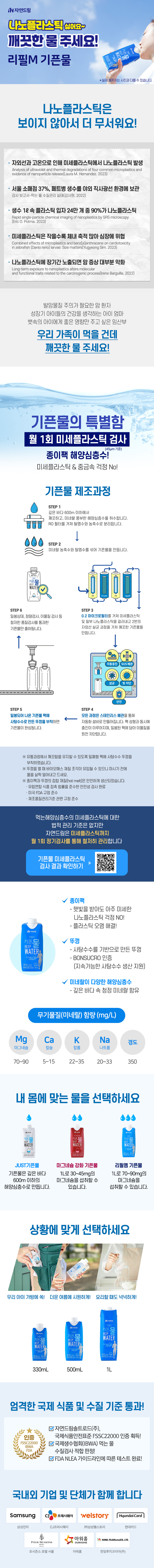 | | | 상품특징 | | 리필엠 1L로 70~90mg 마그네슘을 섭취할 수 있습니다. 땀을많이 흘리는 운동 후에 드시면 좋습니다. | | | | 생산과정 | | 원수 자외선 살균 → 탈염수 저장 → 미네랄 용해 → 블렌딩 → 자외선 살균 → 필터링 → 먹는해양심층수 저장 → 자외선 살균 → 충진 → 포장 → 검사 후 출하 | | | 이용방법 및 주의사항 | | *제품에 직접 입을 대고 음용 시, 입 안의 이물이 제품 내 혼입될 수 있으므로 주의하시기 바랍니다. *가방 내 제품 보관 시, 종이팩이 파손될 수 있으므로 보관 시 주의하시기 바랍니다. *직사광선을 피해 깨끗하고 건조한 곳에 보관하시기바랍니다. *뚜껑을 열었을 때에는 미생물이 증식할 우려가 있으므로 가급적 짧은 기간에 소비하시기 바랍니다. 개봉 후에는 냉장보관하시기 바랍니다. *용기째 가열 또는 동결하지 마시기 바랍니다. 끓이거나 얼렸을때 백색 침전물이 생길수 있으나 천연미네랄성분이므로 품질에는 문제가 없습니다. *뚜껑 개봉 시, 종이팩 원단 내부의 빛 차단 목적으로 들어가는 알루미늄이 뚜껑 톱니에 잘려 내부에 혼입될 가능성이 있습니다. 음용 시 알루미늄박이 확인될 경우 음용하지 마시고 반품 요청드립니다. *기픈물 섭취 시 속뚜껑을 삼키지 않도록 주의하시기 바랍니다. *섭취 후 분리수거를 위해 뚜껑 분리 시 뚜껑 톱니바퀴에 손이 베이지 않도록 주의하시기 바랍니다. *유통 과정에서 깨끗함을 유지할 수 있는 사탕수수 뚜껑을 사용하였습니다. *뚜껑을 열 때 바이오매스 재질 조각이 유입될 수 있으니 마시기 전에 물을 살짝 덜어내고 드세요. | | | 기타사항 | | 본 제품은 소비자 분쟁 해결기준(공정위 고시)에 의거 교환 또는 보상 받을 수 있습니다.