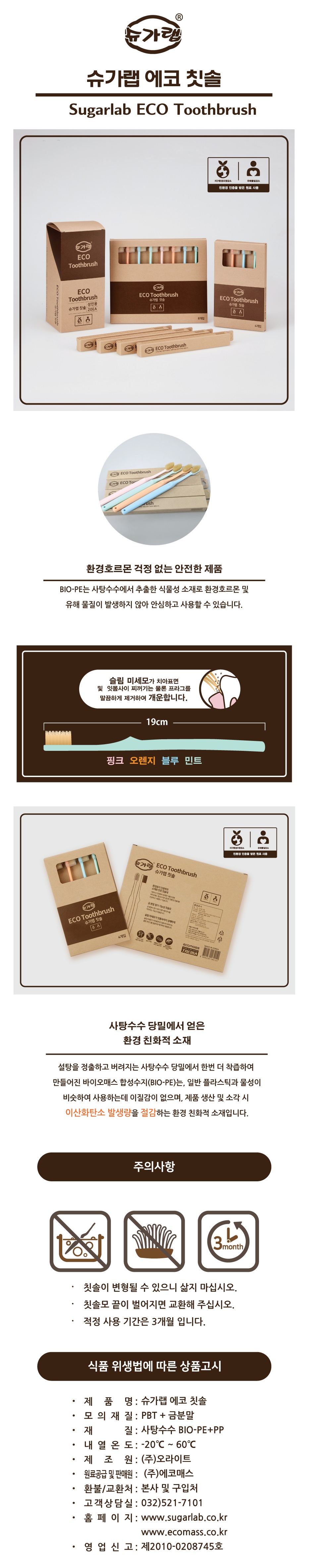| 품명 및 모델명 | 슈가랩친환경칫솔 | | 법에 의한 인증·허가 등을 받았음을 확인할 수 있는 경우 그에 대한 사항 | 상세정보참조 | | 제조국 또는 원산지 | 한국 | | 제조자, 수입품의 경우 수입자를 함께 표기 | 에코매스 | | A/S 책임자와 전화번호 또는 소비자상담 관련 전화번호 | 상담팀 1577-6009 |