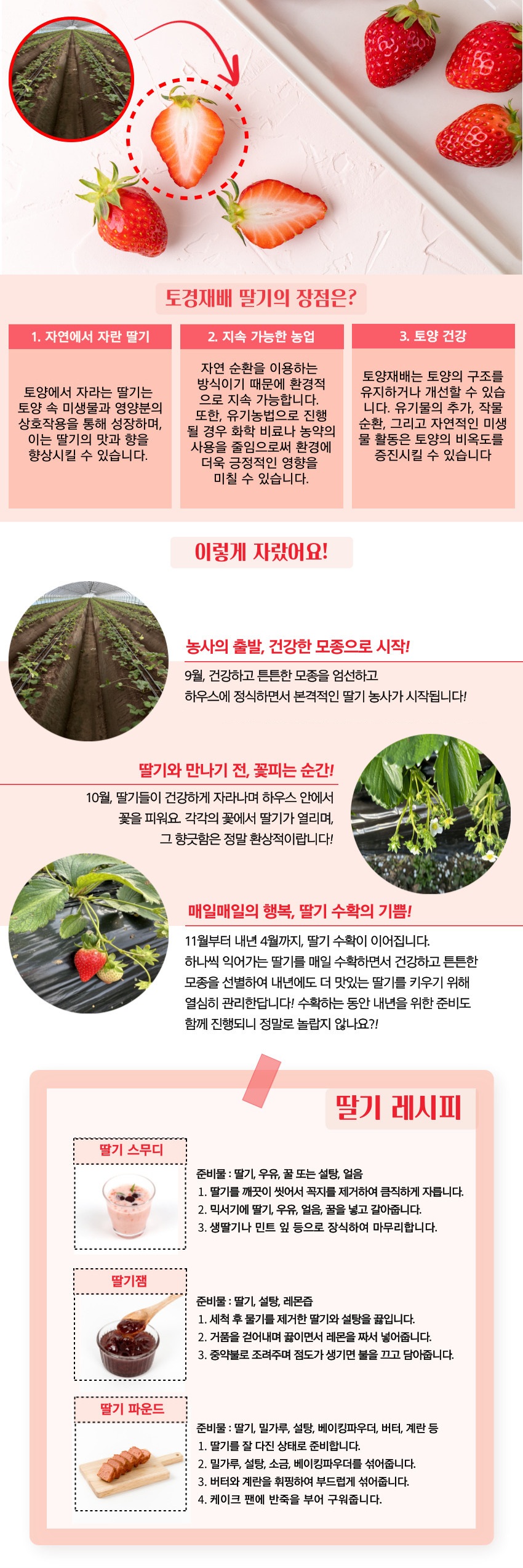 | | | 상품특징 | | - 토경재배 딸기로 맛과 향이 좋습니다. - 특 규격은 사이즈 큰 딸기만 추가 선별하였습니다. - 아랫단 눌림 방지하기 위해 1단 팩 포장하였습니다. - 특 상품은 딸기 사이 짓무름을 방지하기 위해 얇은 스티로폼 패킹을 추가하였습니다. | | | 이용방법 | | 생딸기주스 만들기 1) 재료: 딸기 1팩, 조각 얼음(5~6개), 생수 1국자, 시럽 1큰술 ① 딸기세척 딸기는 꼼꼼히 씻으면 과실이 뭉그러지기 쉽고 세제가 배어들어 맛과 향을 잃게 됩니다. 이에, 세척 시 소쿠리에 담아 흐르는 물에 헹구어 세척하시면 됩니다. ② 꼭지제거 칼을 이용하여 꼭지 부분을 완전히 제거해 주세요. ③ 딸기주스 만들기 믹서에 조각 얼음과 생수, 시럽을 넣고 곱게 갈아 줍니다. 얼음이 곱게 갈리면, 씻어둔 딸기를 넣고 5초 동안 갈아주시면 시원하고 맛있는 딸기주스가 완성됩니다. ※ 참고사항 주스는 취향에 따라 시럽은 빼고 물의 양을 줄이고 갈아드셔도 좋으며, 시럽 대신 꿀을 넣으셔도 좋습니다. | | | 생산과정 | | 1. 딸기의 생산과정 ① 육묘 재배 과정 4월경 자가 육묘장에 장희, 설향 품종의 어미 모를 정식하여 8월말까지 런너를 받습니다. (런너는 어미 모에서 나오는 일명 종자이며, 올해 딸기 농사를 짓기 위해서는 꼭 필요한 과정입니다.) ② 정식 9월경 자가 육묘장에서 채취한 런너를 시설 하우스에 정식합니다.(정식은 묘를 땅에다 심기 위한 작업입니다.) ③ 개화 및 수정 정식 후 10월 초가되면 딸기 꽃이 피고, 벌로 수정 작업을 합니다. ④ 비대(꽃이 과육으로 변하는 과정) 벌로 수정이 되면 수정된 꽃에서 딸기가 형성되고, 각종 영양분 섭취로 인해 크기 시작하면서 착색이 됩니다. ⑤ 수확 착색이 되면 생산지에서 수확하여 공급합니다. ※ 딸기는 한 육묘에서 계속해서 꽃이 나오기 때문에 설향은 11월 말부터 5월 초순까지 수확하여 공급합니다. | | | 참고사항 | | - 딸기는 연하고 상하기 쉬워 유통 중 표면이 눌리거나 짓무를 수 있습니다. - 품질 및 신선도에는 이상이 없으니 수령 직후 바로 섭취하시기 바랍니다. | |