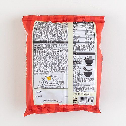 | | | 공급시기 | | 기획공급 | | | 식품유형 | | 유탕면 | | | 생산지 | | 1. 생산지명 : 쿱푸드시스템 주식회사 2. 주소 : 전남 구례군 용방면 용방로 107-74 * 액체스프 제조원 : 동원홈푸드 | | | 원부재료 | | *면_밀가루(우리밀:국산),변성전분,팜유(말레이시아산),감자전분(감자:국산),글루텐(우리밀:국산),소금(국산),채소조미액,미감유아이,탄산칼륨,구아검,탄산나트륨,올레오레진로즈메리,d-토코페롤(혼합형),비타민B2 *액상스프:고추장[올리고당,밀가루(우리밀:국산),고춧가루(국산),밀쌀(국산),소금(국산)],유기농설탕25%,발효식초,양파(국산),사과퓨레(사과:국산),고춧가루1,소금(국산),마늘,사과농축과즙액,고추엑기스,정제수,고춧가루2,참기름(참깨:국산),곡류가공품,효모추출물,파프리카추출색소,5'-리보뉴클레오티드이나트륨,구아검,구연산,생강분말,흑후추분말,호박산이나트륨 [밀, 대두 함유] | | | 중량설명 | | 137g | | | 포장재질 | | (내면)폴리프로필렌 | | | 유통기한 | | 제조일로부터 3개월 | | | 보관방법 | | 직사광선을 피하고 서늘하고 건조한 곳에 보관하십시오. 본 제품은 농산물 원료를 주로 사용하여 벌레의 영향을 받기 쉬우니 포장이 파손도지 않도록 보관에 유의해 주시고, 개봉 후에는 즉시 조리해 드십시오. | | | 영양성분표시 | |