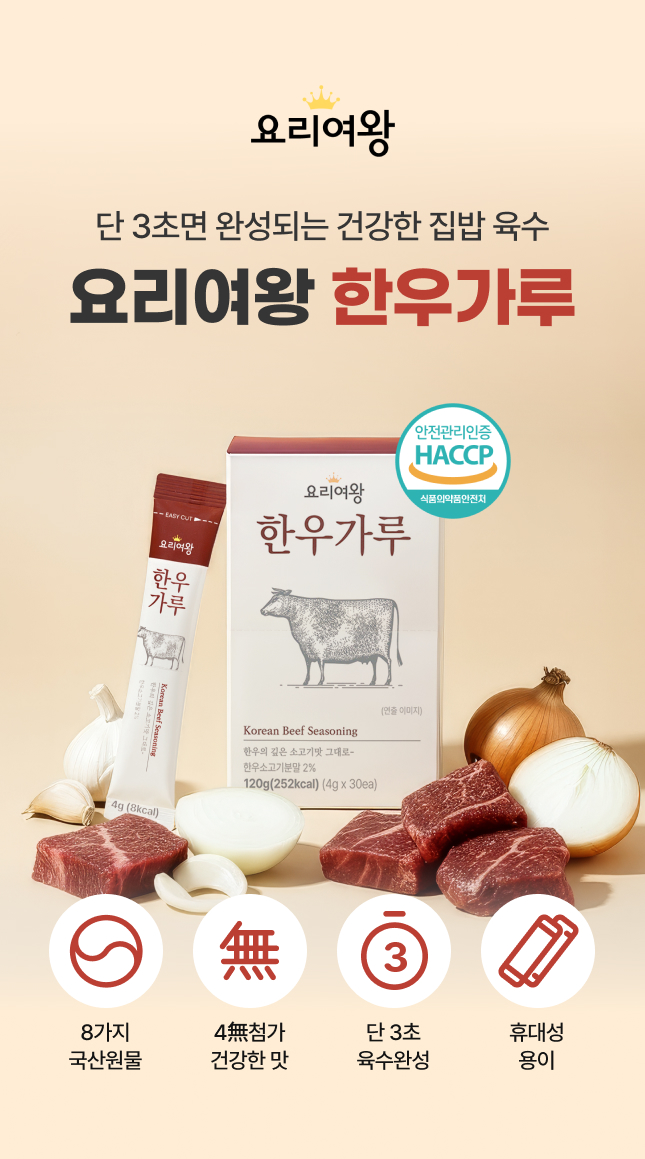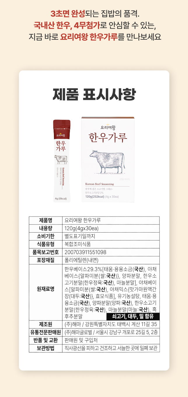 | | | 공급시기 | | 기획공급 | | | 식품유형 | | 복합조미식품 | | | 생산지 | | (주)해마/ 강원특별자치도 태백시 계산 11길 35 | | | 원부재료 | | 한우베이스29.3%[태움·용융소금(국산),야채베이스{알파미분(쌀:국산)},양파분말,한우소고기분말(한우정육:국산),마늘분말],야채베이스[알파미분(쌀:국산),야채믹스{맛가마원액간장(대두:국산)},효모식품],유기농설탕,태움·용융소금(국산),양파분말(양파:국산),한우소고기분말(한우정육:국산),마늘분말(마늘:국산),흑후추분말 쇠고기,대두,밀 함유 | | | 중량설명 | | 120g(4g*30ea) | | | 포장재질 | | 폴리에틸렌(내면) | | | 소비기한 | | 별도표기일까지 | | | 보관방법 | | 직사광선을 피하고 건조하고 서늘한 곳에 밀폐보관 | | | 영양성분표시 | | 총 내용량 120g(100g기준 210Kcal) 나트륨 12,886mg 644% 탄수화물 44g 14% 당류 25g 25% 지방 0.8g 1% 트랜스지방 0g 포화지방 0.5g 3% 콜레스테롤 4mg 1% 단백질 16g 30% 1일 영양성분 기준치에 대한 비율(%)은 2,000kcal기준이므로 개인의 필요 열량에 따라 다를 수 있습니다. | |
