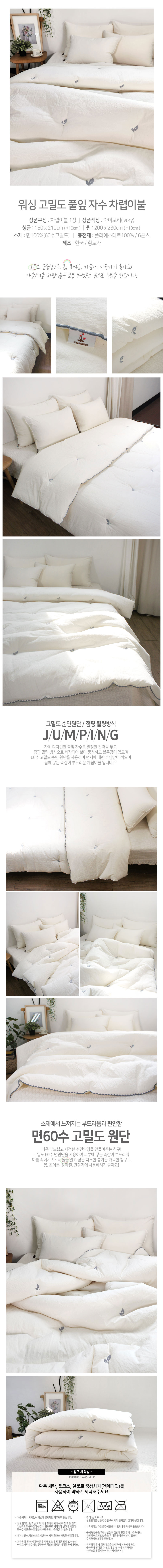 | 상품 소재 (섬유의 조성 또는 혼용률을 백분율로 표시, 충전재를 사용한 상품은 충전재를 함께 표기) | 상세정보 참고 | | 색상 | 아이보리 | | 치수 | 상세정보 참고 | | 상품구성 | 워싱고밀도풀잎자수차렵이불(퀸) | | 제조자, 수입품의 경우 수입자를 함께 표기 (병행수입의 경우 병행수입 여부로 대체 가능) | 황토가 (경남 양산시) | | 제조국 | 한국 | | 세탁방법 및 취급시 주의사항 | 상세정보 참고 | | 품질보증기준 | 관련 법 및 소비자분쟁해결 기준에 따름 | | A/S 책임자와 전화번호 | 상담팀 1577-6009 |