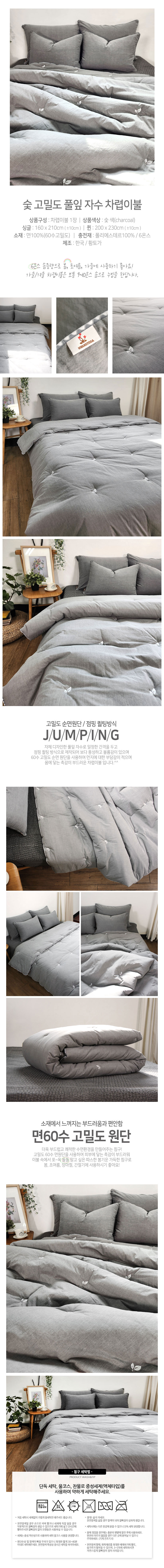 | 상품 소재 (섬유의 조성 또는 혼용률을 백분율로 표시, 충전재를 사용한 상품은 충전재를 함께 표기) | 상세정보 참고 | | 색상 | 숯색 | | 치수 | 상세정보 참고 | | 상품구성 | 숯고밀도풀잎자수차렵이불(싱글) | | 제조자, 수입품의 경우 수입자를 함께 표기 (병행수입의 경우 병행수입 여부로 대체 가능) | 황토가 (경남 양산시) | | 제조국 | 한국 | | 세탁방법 및 취급시 주의사항 | 상세정보 참고 | | 품질보증기준 | 관련 법 및 소비자분쟁해결 기준에 따름 | | A/S 책임자와 전화번호 | 상담팀 1577-6009 |