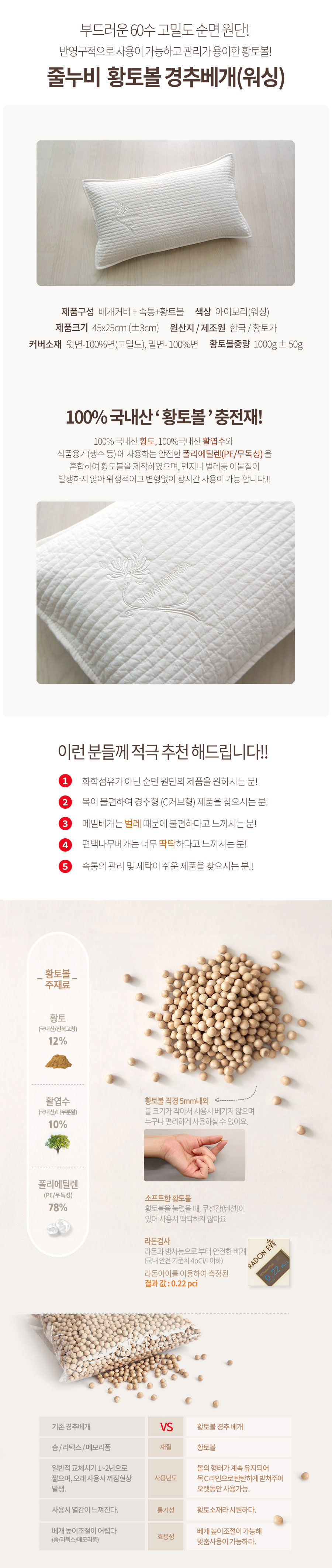 | 상품 소재 (섬유의 조성 또는 혼용률을 백분율로 표시, 충전재를 사용한 상품은 충전재를 함께 표기) | 상세정보 참고 | | 색상 | 아이보리 | | 치수 | 상세정보 참고 | | 상품구성 | 줄누비황토볼경추베개(워싱) | | 제조자, 수입품의 경우 수입자를 함께 표기 (병행수입의 경우 병행수입 여부로 대체 가능) | 황토가 (경남 양산시) | | 제조국 | 한국 | | 세탁방법 및 취급시 주의사항 | 상세정보 참고 | | 품질보증기준 | 관련 법 및 소비자분쟁해결 기준에 따름 | | A/S 책임자와 전화번호 | 상담팀 1577-6009 |