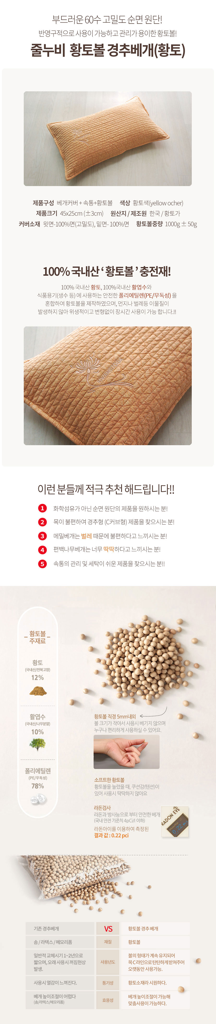 | 상품 소재 (섬유의 조성 또는 혼용률을 백분율로 표시, 충전재를 사용한 상품은 충전재를 함께 표기) | 상세정보 참고 | | 색상 | 황토색 | | 치수 | 상세정보 참고 | | 상품구성 | 줄누비황토볼경추베개(황토) | | 제조자, 수입품의 경우 수입자를 함께 표기 (병행수입의 경우 병행수입 여부로 대체 가능) | 황토가 (경남 양산시) | | 제조국 | 한국 | | 세탁방법 및 취급시 주의사항 | 상세정보 참고 | | 품질보증기준 | 관련 법 및 소비자분쟁해결 기준에 따름 | | A/S 책임자와 전화번호 | 상담팀 1577-6009 |