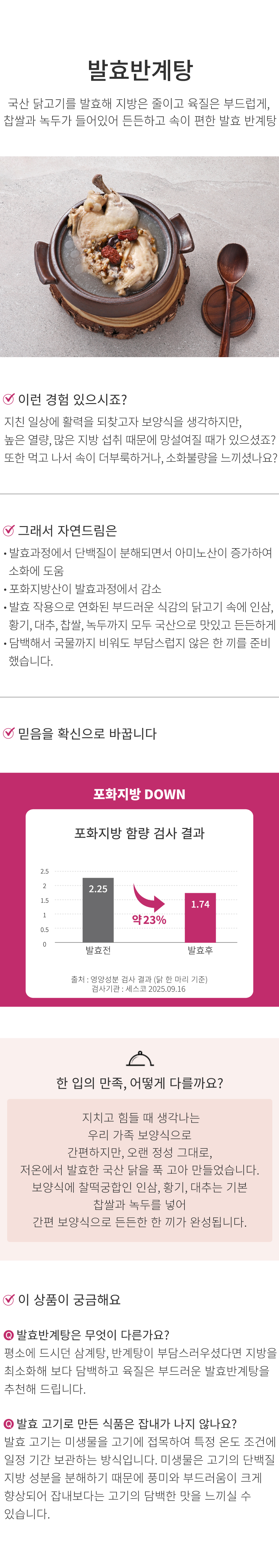 | | | 물품특징 | | ● 괴산 자연드림파크 1단지 프라이드리 탕공방에서 직접 생산하는 제품입니다. ● 집에서 간편하게 데워 드실 수 있습니다. | | | 이용방법 | | ● 냉장보관 하시고 개봉 후에는 변질 우려가 있으니 가능한 한 빨리 드십시오. ● 조리방법 1) 발효반계탕 1봉(800g)을 냄비에붓고 약 7분간 끓여드시기 바랍니다. 2) 기호에 따라 물을 약 반컵(100ml) 부어 끓여드시기 바랍니다. ● 냄비나 뚝배기에 내용물을 부어 충분히 데워 드십시오. ● 터질 우려가 있으니, 끓는 물에 봉지째 넣거나 봉지 그대로 조리하지 마시고 조리방법을 준수하십시오. ● 전자레인지에 봉지째 넣거나 과도한 압력을 가하지 마세요. (전자레인지 사용 시, 전용 용기를 사용하십시오.) ● 기호에 따라 파, 소금, 후추 등을 넣어 드시면 더욱 좋습니다. | | | 생산과정 | | 입고/보관-전처리(세척)-속재료넣기-충진(육계,육수)-금속검출기 -살균기(살균)-외포장/보관/출하 | | | 기타사항 | | ● 본 제품은 쇠고기, 돼지고기, 닭고기, 대두, 밀, 새우를 사용한 제품과 같은 제조시설에서 생산하고 있습니다. ● 포장지 모서리가 날카로워 베일 수 있으니 주의 바랍니다. ● 황기,대추의 씨, 뼈가 들어가 있는 제품이므로 치아 손상 및 입안 상처가 생기거나 목에 걸리지 않게 주의하십시오. | |