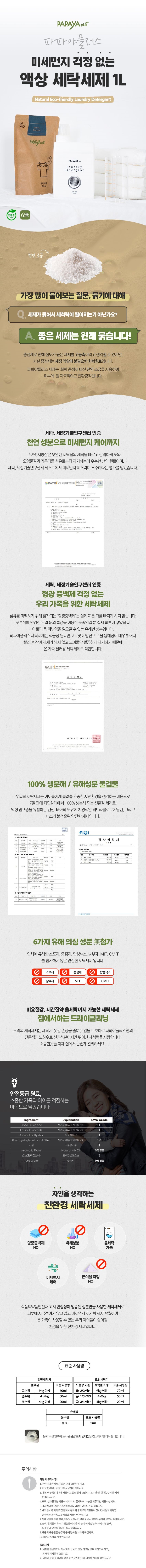 | 품명 및 모델명 | 파파야액상세탁세제*1000ml | | 법에 의한 인증·허가 등을 받았음을 확인할 수 있는 경우 그에 대한 사항 | 상세정보 참조 | | 제조국 또는 원산지 | 한국 | | 제조자, 수입품의 경우 수입자를 함께 표기 | 베스트비 | | A/S 책임자와 전화번호 또는 소비자상담 관련 전화번호 | 상담팀 1577-6009 |