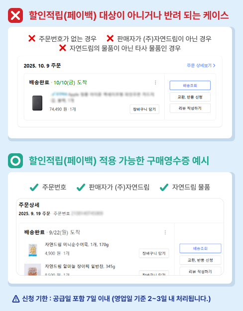- 할인적립 후 해당 주문 취소 시 적립 금액은 자동으로 회수 처리 됩니다. - 영수증 인증 시 구매 날짜, 판매처명, 자연드림 상품명, 결제금액과 바코드가 포함된 전체 이미지가 필요하며, 온라인 판매처에서 구매한 경우 반드시 주문번호가 확인되어야 합니다. - 온라인 외부판매처에는 동일·유사 상호가 있을 수 있으니, 구매 전 반드시 자연드림 공식판매처인지 확인해 주세요. - 자연드림 공식판매처에서 구매한 자연드림 상품만 할인적립이 가능합니다. - 그 외 적립 관련 문의는 자연드림 고객센터(1577-6009) 또는 자연드림 앱 내 1:1 문의를 이용해 주시기 바랍니다.