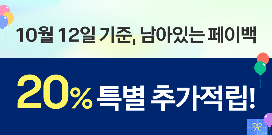 ■ 내용 : 기존 이벤트(발효식품 개발 성공 이벤트) 페이백 잔액의 20%를 추가 페이백으로 지급 * 이벤트 종료 시점인 10월 12일 24시(= 10월 13일 0시)의 이벤트 페이백 잔액 기준 ■ 지급 시기 : 2025년 10월 14일 6시까지 적립(예정). 적립 즉시 사용 가능. ■ 유효기간 : 지급일로부터 1년