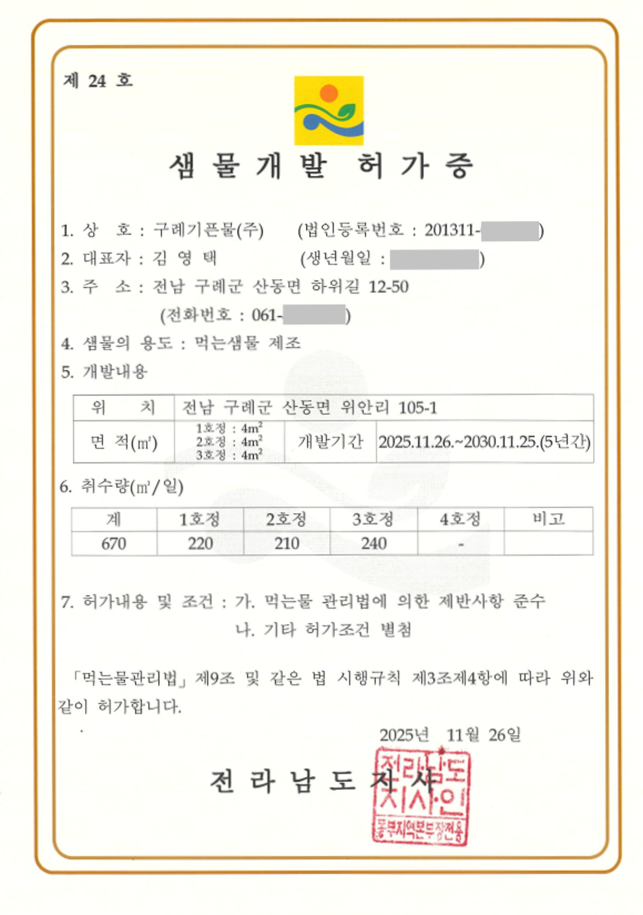 ‘구례 기픈물(주)’이 2025년 11월, 먹는 샘물(생수) 생산을 위한 취수 허가를 획득했습니다.
