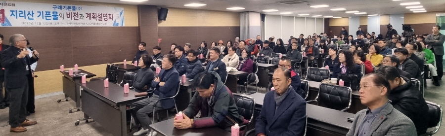 12월 12일 금요일, 구례자연드림파크에 구례군민 120여 명이 모였습니다. (주)구례기픈물의 사업 설명회에 참석하기 위해서였습니다. 아이쿱홀에 구례군의 2개 언론사 카메라가 설치되면서 행사에 대한 기대감이 서서히 올라가기 시작했습니다. "2011년, 구례자연드림파크로 시작된 구례군, 군민들과의 소중한 인연이 14년이 되었습니다. 이제 (주)구례기픈물의 먹는 샘물 사업으로 아이쿱자연드림과 구례군의 관계를 한 단계 발전시키고자 합니다." 이렇게 시작된 '지리산 기픈물의 비전과 계획 설명회'는 구례군민들의 뜨거운 관심 속에 진행되었습니다. 일반적인 기업이 사업 계획을 주민에게 상세히 설명하는 자리가 드물다는 점에서 더욱 의미를 더했습니다.
