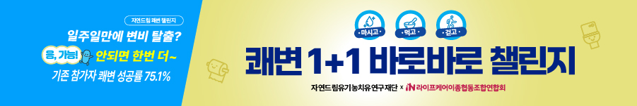 - 자연드림 쾌변 챌린지는 자연드림유기농치유연구재단과 iN라이프케어이종협동조합연합회가 공동으로 주관하는 생활습관 개선 프로그램으로서, 의료법상 의료행위가 아닙니다. 본인의 건강상태에 대한 구체적인 의학적 판단은 전문의와 상의하시기 바랍니다.