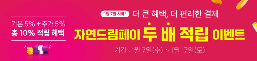 기본 5% 적립 + 이벤트 5% 추가 적립 => 총 10% 적립! 자연드림페이 혜택을 두배로 누려보세요~ 이벤트 기간 : 1월 7일(수) ~ 1월 17일(토)
