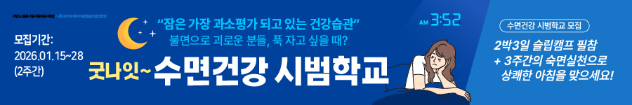 모집 대상 및 기간· 모집 대상 : 불면으로 괴로운 자연드림 회원(실버회원 포함) · 초기 불면증, 만성 불면증, 수면리듬장애 등 수면장애 환자 환영 · 수면무호흡증, 사지불안증후군, 기면증, 렘수면행동장애 등 병적 수면장애도 참가 가능 · 모집기간 : 2026년 1월 15일(목) ~ 1월 28일(수), 2주간