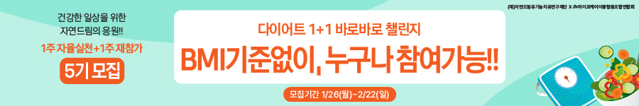 다이어트 1+1 바로바로 챌린지 참가자 모집(5기) 2026년 1월 26일(월) ~ 2월 22일(일) ■ 신청방법 및 선정안내① [ 자연드림몰 > 커뮤니티 > 다이어트(식이조절) ] 접속 ( * 회원가입/로그인 필수) ② [신청] 말머리 선택 후, ‘사연’ 작성 ③ 사연작성 후, 추가로 <신청서> 작성 · 제출해야 신청 완료 ⇒ 심사 후 선정자는 [다이어트(식이조절)] 게시판을 통해 발표, 상세 내용은 개별 연락 ■ 프로그램 개요