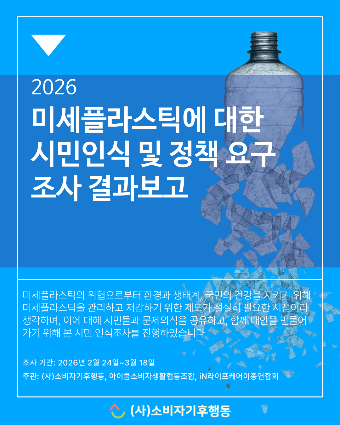 (사)소비자기후행동이 지난 2월 24일부터 전국 시민 6,355명을 대상으로 '미세플라스틱 시민 인식조사'를 실시한 결과, 응답자의 70.5%가 미세플라스틱 관련 뉴스를 '여러 번' 접한 적이 있다고 답했고, 20.4%는 '한두 번' 접한 경험이 있다고 응답해, 전체의 90.9%가 관련 보도를 접한 것으로 나타났습니다. 또한 응답자의 94.3%는 미세플라스틱이 건강이나 환경에 위험할 수 있다고 인식하고 있었으며, 91.1%는 일상생활에서 미세플라스틱에 노출될 가능성이 있다고 응답해, 위험성과 노출 가능성에 대한 인식이 매우 높은 것으로 나타났습니다. 아울러 응답자의 90.6%는 미세플라스틱 저감을 위해 정부 차원의 정책 대응이 필요하다고 답했으며, 특히 관리 기준 마련에 대한 요구가 가장 높은 것으로 확인되었습니다. 소비자기후행동은 2021년부터 미세플라스틱의 위험성을 알리고 관리 기준 마련의 필요성을 제기해왔으며 공론화에 앞장서 왔습니다. 2022년과 2024년에는 이수진 국회의원실과 함께 「미세플라스틱 저감 및 관리에 관한 특별법」을 발의하며 제도적 대응을 촉구해왔습니다. 그러나 해당 법안은 현재까지 국회에 계류된 채 논의가 진전되지 않고 있는 상황입니다. 소비자기후행동은 이번 조사 결과를 통해 미세플라스틱 문제에 대한 국회의 책임있는 역할이 여전히 부족하다는 점을 확인하였습니다. 미세플라스틱으로 인한 환경과 생활 전반의 위협이 확대되고 있는 상황에서, 제도적 대응은 더 이상 지연되어서는 안됩니다. 미세플라스틱 문제는 더 이상 미래의 위험이 아니라 이미 우리의 일상 속에 깊이 들어온 현실입니다. 최근 김성환 기후에너지환경부장관이 간담회를 통해 미세플라스틱에 대한 선제적 대응을 약속한 만큼, 이제는 선언을 넘어 실질적인 정책과 제도로 이어져야 할 때입니다. |