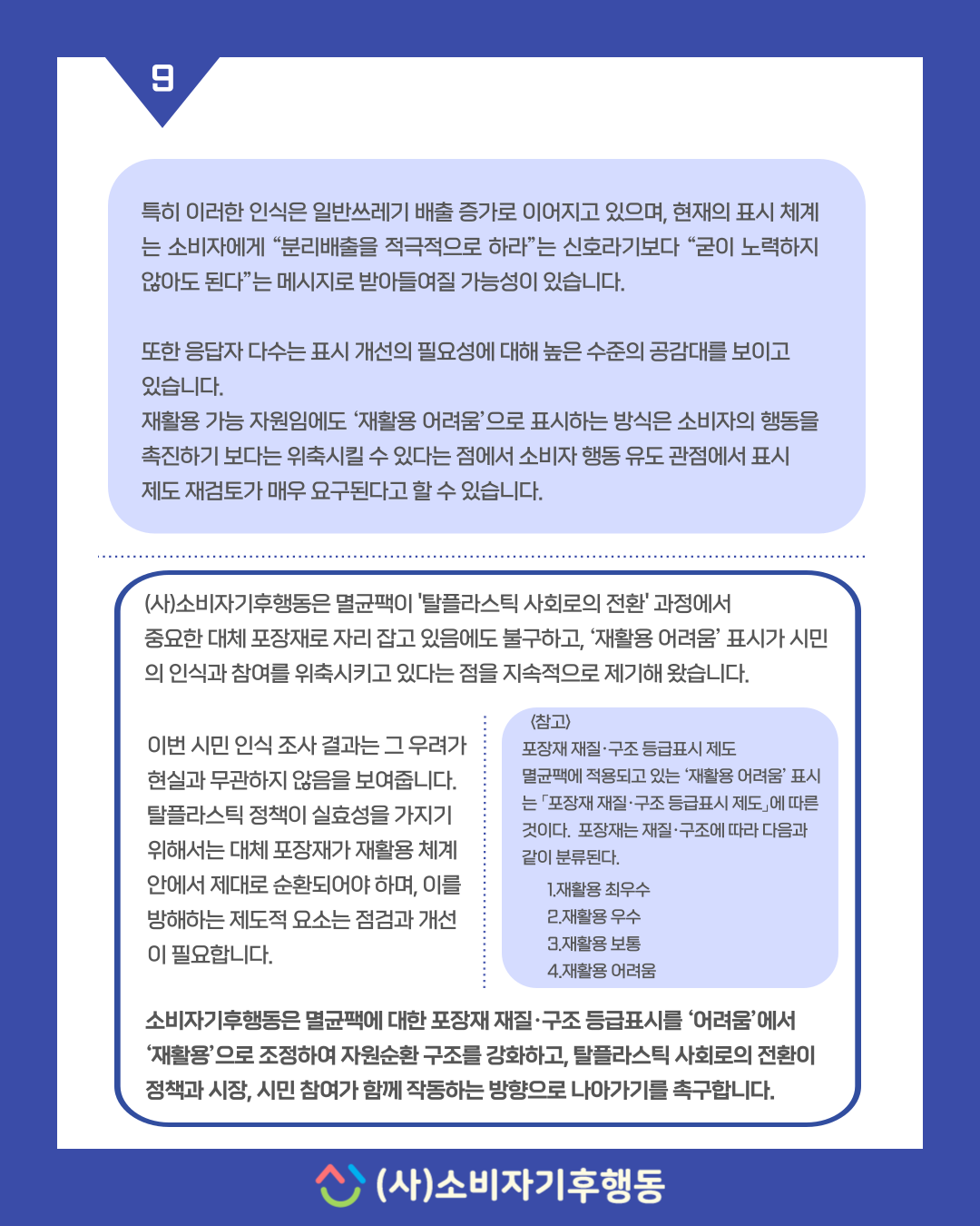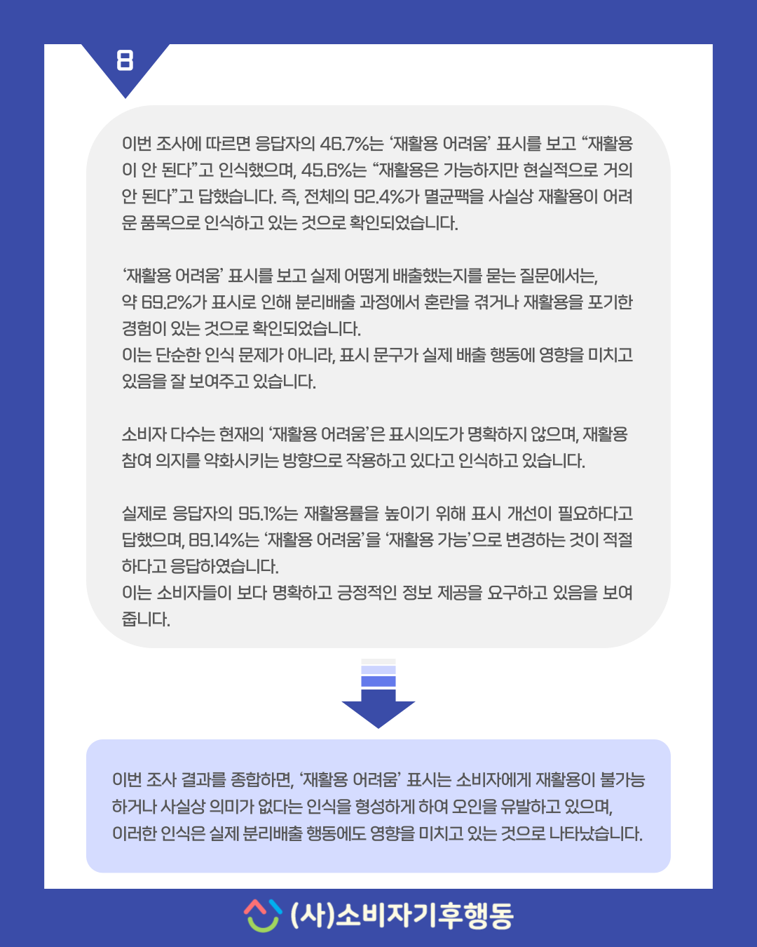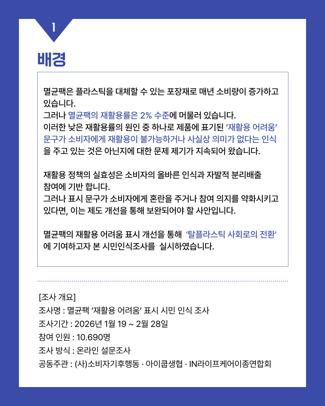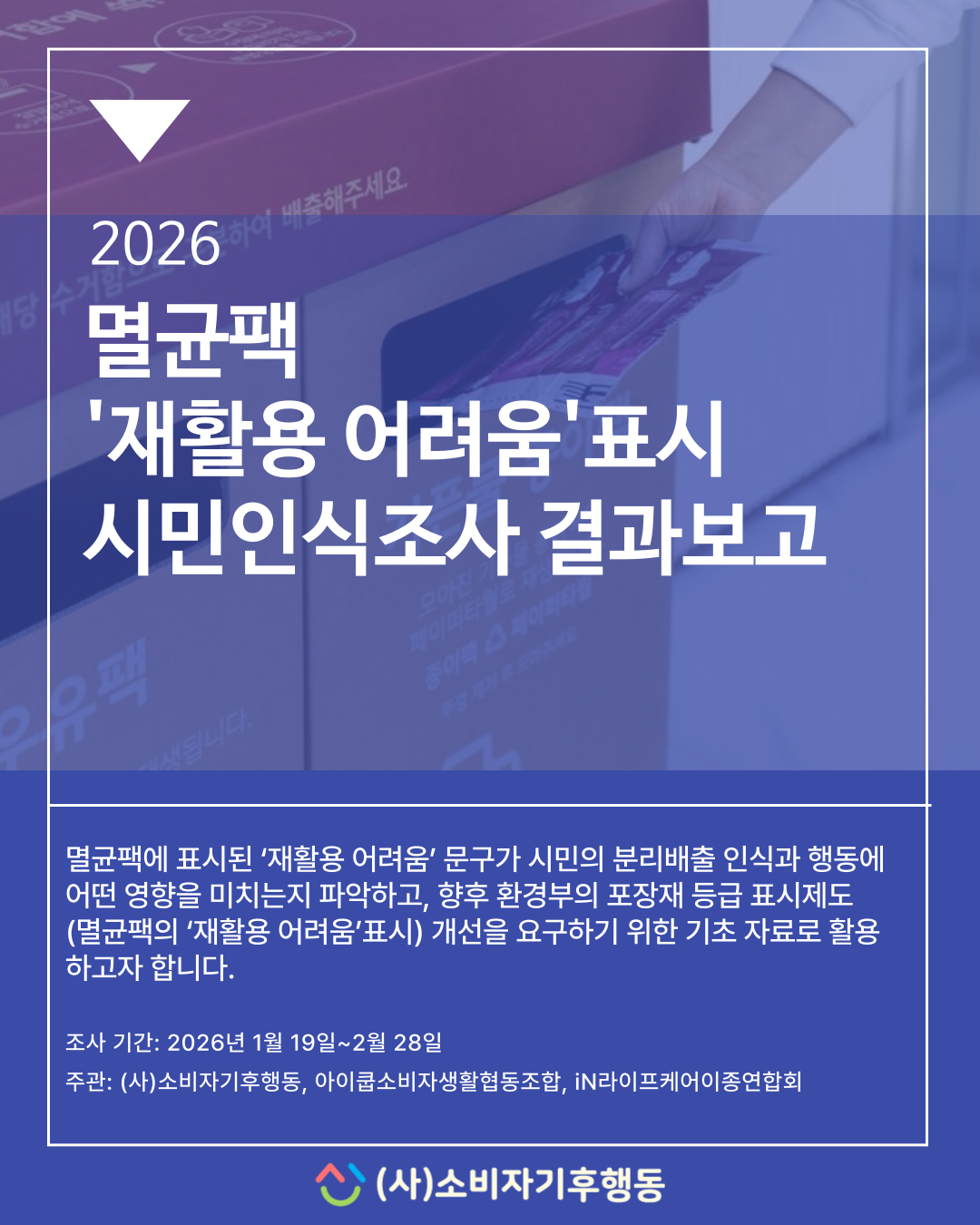멸균팩은 기술적으로 재활용이 가능한 자원임에도 불구하고, 국내 재활용률은 약 2% 수준에 머물러 있습니다. 이러한 낮은 재활용률의 원인 중 하나로 제품에 표기된 '재활용 어려움' 문구가 소비자에게 재활용이 불가능하거나 사실상 의미가 없다는 인식을 주고 있는 것은 아닌지에 대한 문제 제기가 지속되어 왔습니다. 이에 (사)소비자기후행동, 아이쿱생협, IN라이프케어이종연합회는 공동으로 「멸균팩 '재활용 어려움' 표시 시민 인식 조사」를 실시하였습니다. ■ 92.4%, 멸균팩을 사실상 재활용 어려운 품목으로 인식 ■ 69.2%, 표시로 인해 분리배출 과정에서 혼란 또는 포기 경험 ■ 95%, 멸균팩 '재활용 어려움' 표시 개선 필요
