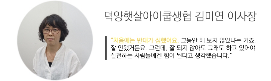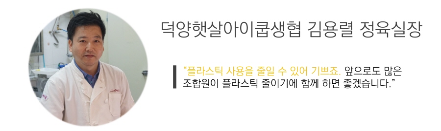 플라스틱 트레이를 줄일 수 있어 좋지만, 작업하기 힘들지 않으신가요? 아무래도 조합원들이 올 때마다 냉장고에서 꺼내 작업을 하다 보니 조금 번거롭긴 하지만, 환경을 위해 제가 할 수 있는 일이기에 당연히 해야 한다고 생각했어요. ‘플라스틱 100% 재활용’을 위한 약속 중 하나가 플라스틱 사용을 줄이는 거잖아요. 플라스틱 트레이 뿐만 아니라 트레이를 감싸는 비닐랩 사용량도 줄일 수 있어 좋은 취지의 캠페인이라고 생각해요.
