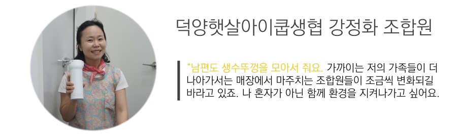 조합원으로서 햇살캠페인에 대해 어떻게 생각하시나요? 햇살캠페인에 함께 참여하는 조합원으로서 ‘실천 의지’라는 단어가 가장 많이 떠올라요. 냉장고의 에너지 절약을 위해 ‘냉장고 다이어트’를 하면서 실천 의지가 중요하다는 생각을 했어요. 사실 귀찮다고 안 하는 것과 지금부터라도 해야겠다는 마음을 먹는 건 정말 종이 한 장 차이거든요. 제 작은 노력 때문인지 얼마 전부터 남편이 플라스틱 생수 뚜껑을 모아서 주더라고요. 뿌듯하기도 하고 더 열심히 활동해야겠다는 다짐을 하게 된 것 같아요.