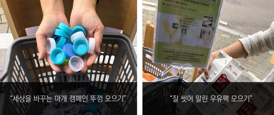 조합원이 가져온 말린 우유갑, 안 쓰는 장바구니, 생수의 마개를 모으기 위해서인데요.