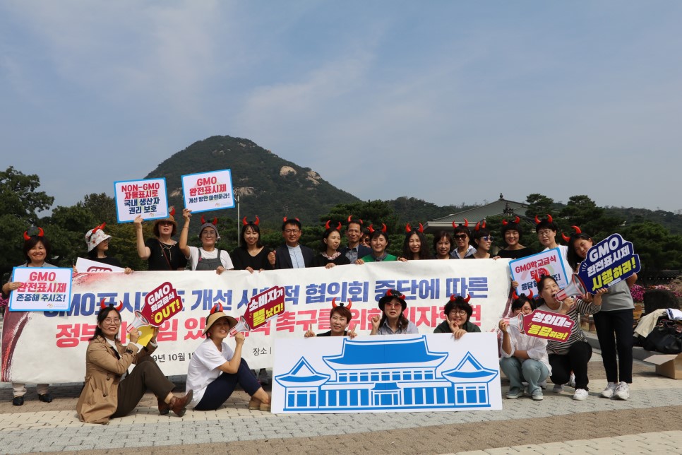 10월 1일 청와대 분수대 앞, (사) 참여하고 행동하는 소비자의 정원(이하 ‘소비자의 정원’) 회원들이 모였습니다. 지난해 GMO 완전표시제 21만 청와대 국민청원을 이루고도, 뒷짐지고 나 몰라라 하는 정부와 식품업계 반발로 GMO 표시제도 개선 사회적협의체 논의가 중단된 상황인데요.