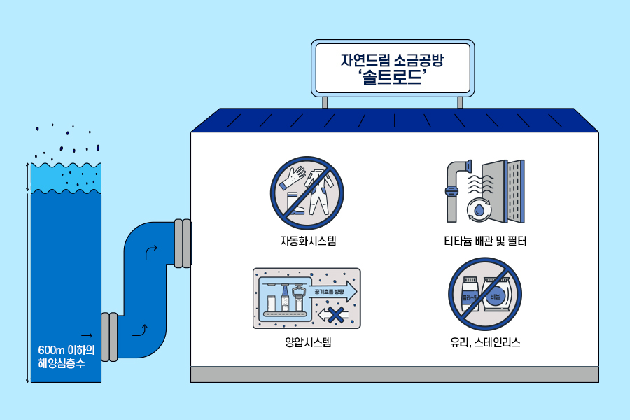 깊은 바다에서 끌어온 물이 소금이 되기까지의 과정에서 미세플라스틱 오염을 차단하기 위해, 최종 소금이 지나가고 머무는 배관 및 필터는 티타늄 재질을 사용했습니다.