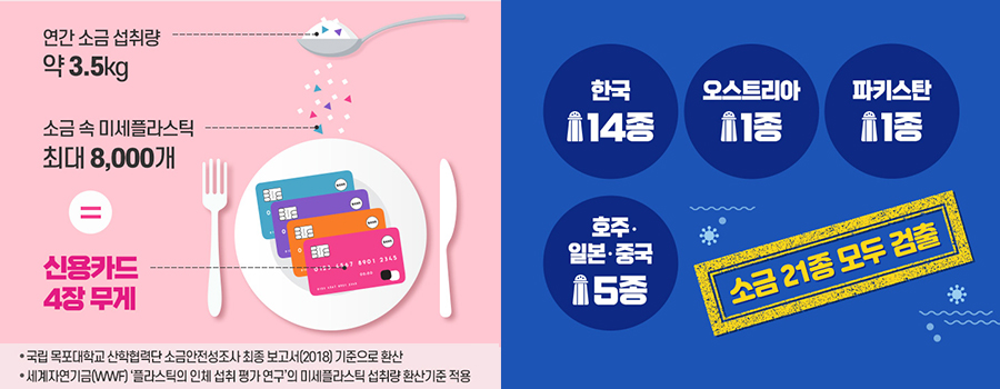 [출처] 1. 국립 목포대학교 산학협력단 소금안전성조사 최종 보고서(2018) 2. 세계자연기금(WWF) ‘플라스틱의 인체 섭취 평가 연구’의 미세플라스틱 섭취량 환산기준 3. 국립환경과학원, 제3기 국민환경보건 기초조사, 2018 4. 한국일보, 해양심층수, 물 만났다, 2016.7.27 5. Steve Allen et al. Atmospheric transport and deposition of microplastics in a remote mountain catchment, Nature Geoscience (2019) 6. https://www.plasticsoupfoundation.org/en/2017/06/microfibers-in-heart-of-himalayas/ 7. 국제자연보전연맹 미세플라스틱 보고서(2017)