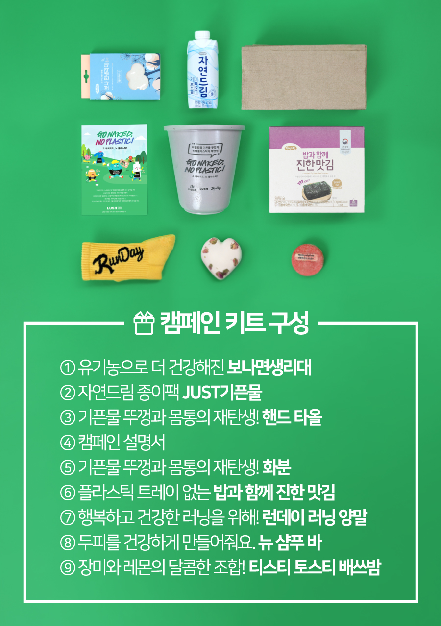 러쉬에 ‘고 네이키드 캠페인’이 있다면, IN자연드림엔 ‘노 플라스틱’ 캠페인이 있죠. 불필요한 포장 쓰레기/일회용 플라스틱을 줄이는 서로의 캠페인 취지에 공감하여 지구의 날에 힘을 모으게 되었답니다. 여기에 환경을 위한 달리기, 걷기를 적극 확산하는 플랫폼 ‘런데이’까지 합세하여 환경 캠페인에 진심인 구성이 되었어요. 모두 앞치마를 입고, 점심시간 여의도에 출동하여 많은 시민들에게 ‘고 네이키드, 노 플라스틱!’ 메시지를 알리고, 거리의 쓰레기도 주울 예정입니다. 당일 오전 11시부터 1시까지, 자연드림 공식 인스타그램에서 라이브로 현장 상황을 생생하게 전하니 많은 관심과 응원 부탁드려요~