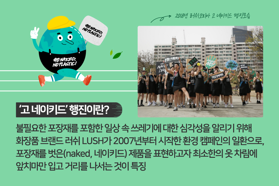 4월 22일은 우리가 살고 있는 지구의 심각한 환경오염 문제를 알리기 위해 제정된 지구의 날이에요. 매년 전국 아이쿱에서도 지구의 날을 기념하여 플로깅, 재활용 등 다양한 기후위기 대응 캠페인을 진행하고 있죠. 올해는 특별히! iN자연드림, 러쉬, 런데이 세 브랜드가 위기의 지구를 구하기 위한 ‘고 네이키드, 노 플라스틱!’ 캠페인에 함께 하게 되었습니다.