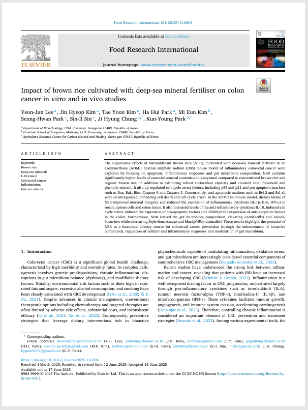 2025년 6월, 자연드림 현미에 대한 연구가 전 세계적으로 권위 있는 식품저널 『Food Research International』*에 실렸습니다. 이로써 자연드림 항암식품은 무려 '여섯 번째' 논문 등재라는 놀라운 성과를 이루었습니다. (*식품 관련 저널 400여 개 중, 10위권의 매우 높은 영향력을 가진 저널)