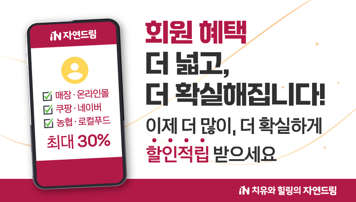 치유와 힐링의 자연드림, 이제 어디서든 함께하세요. ※ 일부 판매처 자체 할인/프로모션과 중복 적용 제외 "서민에게도 친환경 농산물을!"이라는 초심으로 시작한 자연드림이 어느덧 30년이 되었습니다. 변함없는 믿음과 사랑으로 함께해주신 회원 여러분 덕분에 자연드림은 이제 더 많은 분들과 가치를 나눌 준비가 되었습니다. 회원 여러분의 목소리에 귀 기울였습니다 "매장이 멀어서 자주 이용하기 어려워요" "온라인 쇼핑할 때도 선택권이 더 있으면 좋겠어요" 이런 목소리를 바탕으로, 더 가까이, 더 편리하게 만날 수 있는 방법을 마련했습니다. 자연드림의 새로운 약속 30년 전 초심으로 시작한 길에서, 이제는 더 넓은 세상과 만납니다. 회원 여러분의 윤리적 소비가 세상을 바꾸었듯, 이제 더 많은 사람들이 자연드림과 함께할 수 있도록 문턱을 낮추고 접근성을 높이겠습니다. 하지만 변하지 않는 것이 있습니다. 회원 여러분은 여전히 자연드림의 가장 소중한 파트너이며, 여러분만의 특별한 혜택은 계속됩니다. 회원 할인적립제도는 단순한 혜택 변경이 아닙니다. 지난 30년의 신뢰를 바탕으로, 더 편리하고 더 가까운 자연드림으로 진화하는 약속입니다. 매일의 장바구니 부담을 줄이고, 치유에 도움이 되는 좋은 식품으로 건강을 지키며, 휴식과 치유 프로그램으로 삶의 여유를 되찾을 수 있도록, 자연드림이 더 가까이에서 함께하겠습니다. 치유와 힐링의 자연드림 생활, 이제 어디서든 회원 여러분과 함께합니다. ※ 본 혜택은 9월 11일, iN라이프케어이종협동조합연합회와 아이쿱생협연합회의 임시총회 의결을 통해 결정되었습니다. 자주 묻는 질문(FAQ) Q1. 기존보다 혜택이 줄어드는 건 아닌가요? A. 아닙니다. 자연드림은 이미 5월부터 상품의 가격을 전체적으로 조정하여 현재의 소비자가 가격이 기존의 회원가보다 낮은 품목이 많습니다. 이 가격에서 다시 가입연수별 20~30% 할인적립을 받으실 수 있습니다. Q2. 가격을 확 낮췄다고 하는데 어떻게 가능한거죠? A. 자연드림은 올해 4월 본격적인 사업변화 안내 이후, 수요가 적은 다수 품목의 재고관리체계 변경, 상품 리뉴얼, 유통·판매와 운영상의 효율화 등 집중과 선택을 통해 절감된 비용을 가격에 반영했습니다. Q3. 적립금은 언제 받을 수 있나요? A. 자연드림 매장은 구매 즉시, 온라인몰은 시범운영 기간(10/13~10/31) 결제 후 즉시 적립됩니다. 외부 공식판매처에서 구매한 경우 일주일 이내 구매인증 후 적립되며, 모든 적립금은 적립 후 1년 동안 자유롭게 사용 가능합니다. Q4. 외부 공식판매처에서 구매한 것은 어떻게 인증하나요?
