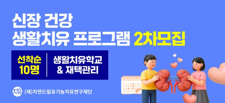 프로그램 구성 1개월 스테이 치유학교 지원 내용 최대 300만원 참가비 전체 금액 중 지원 * 5단계(GFR 분당 15ml 미만) 해당자는 담당 의사 동의 하에 개별 상담 후 참여 가능 여부를 결정합니다. * 참가비 관련 보험 적용 여부는 개인 약관에 따라 다를 수 있으며, 참여 전 개별 확인을 안내드립니다. 신청 방법① 자연드림몰 > 커뮤니티 > 치유학교 Talk 접속 (*회원가입/로그인 필수) ② [치유학교 Talk] - [신장 건강] - [신청] 말머리 선택 후, ‘신청 사연’ 작성 ③ 작성 확인 후 담당자가 별도로 연락을 드립니다. 문의 전화 : 043-925-9998, 1577-6009(상담센터)※ 필독 안내 및 유의사항