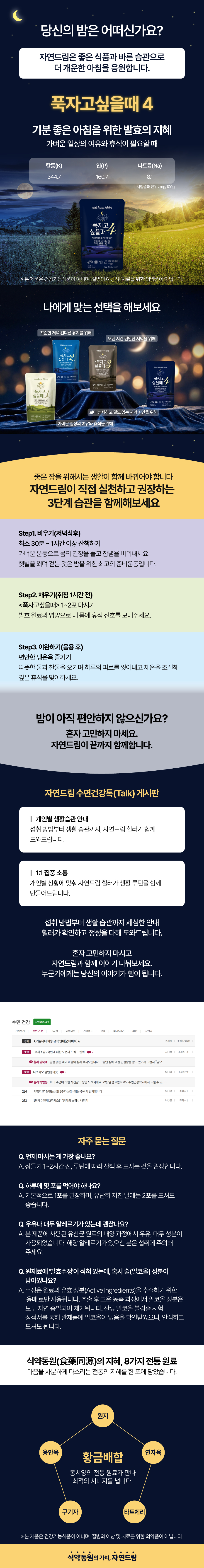 | 상품공지 | 물품명 : 푹자고싶을때1*100ml*7포*자연이정답이다 중량/규격 : 100ml*7포 산지명 : 자연이정답이다 물품명 : 푹자고싶을때2*100ml*7포*자연이정답이다 중량/규격 : 100ml*7포 산지명 : 자연이정답이다 물품명 : 푹자고싶을때3*100ml*7포*자연이정답이다 중량/규격 : 100ml*7포 산지명 : 자연이정답이다 물품명 : 푹자고싶을때4*100ml*7포*자연이정답이다 중량/규격 : 100ml*7포 산지명 : 자연이정답이다 기간 : 2026-03-27 ~ 2026-04-30 사유 : 괴산자연드림파크의 (주)자연이정답에서 `푹자고싶을때1~4` 물품을 신규공급 안내 하오니 많은 애용 부탁드립니다. 1. 대상물품 - 푹자고싶을때1*100ml*7포*자연이정답이다 - 푹자고싶을때2*100ml*7포*자연이정답이다 - 푹자고싶을때3*100ml*7포*자연이정답이다 - 푹자고싶을때4*100ml*7포*자연이정답이다 - 소비기한 : 제조일로부터 6개월까지 - 보관방법 : 실온보관 2. 물품특징 . 시금치, 깻잎, 녹차, 미강을 발효하여 자연 유래 원료의 가치를 담았습니다. . 용안육·원지·연자육·구기자에 타트체리를 더해 동서양 전통 원료가 조화를 이루는 프리미엄 블렌딩 음료입니다. . 정성껏 추출한 원액을 한 번 더 농축해 깊고 진한 풍미를 완성했습니다. . 마그네슘강화 기픈물을 사용하여 풍부한 미네랄까지 담았습니다. . 바쁜 일상 속 편안한 휴식을 위한 한 잔을 제안합니다.` 3. 주문가능일 - 자연드림몰 : 26년 3월 28일 (토) 부터~ 4. 공급가능일 . 푹자고싶을때3*100ml*7포*자연이정답이다 : 3월 31일(화) . 푹자고싶을때4*100ml*7포*자연이정답이다 : 4월1일(수) . 푹자고싶을때1*100ml*7포*자연이정답이다 : 4월2일(목) . 푹자고싶을때2*100ml*7포*자연이정답이다 : 기존 푹자고싶을때 재고 소진 시점 원부재료에 眞心인 자연이정답이다는 바른 먹거리를 위해 최선을 다해 물품을 생산하겠습니다. 많은 관심과 애정 부탁드립니다. 감사합니다. 담당부서 : 자연이정답이다 |
