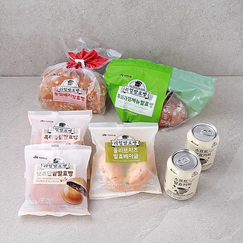 6. 소프트SOFT발효커피 정제수,소프트(SOFT)발효커피[커피(르완다),곡류가공품(쌀/국산),조제종국],천연향료(커피향),혼합제제(향료,프로필렌글리콜,곡물주정) | | | 중량설명 | | 845.48 g (통밀베리발효빵 345g*1개, 무화과깜빠뉴발효빵 240g*1개, 올리브치즈발효베이글 100g*1개, 넛츠단팥발효빵 80g*1개, 흑미통팥발효빵 80g*1개, 소프트발효커피*캔 238ml*2개) | | | 포장재질 | | 1. 통밀베리발효빵,무화과깜빠뉴발효빵,올리브치즈발효빵,넛츠단팥발효빵,흑미통팥발효빵 : 폴리프로필렌 2. 소프트SOFT발효커피 : 알미늄 캔 / 질소충전 | | | 소비기한 | | * 별도 표기일까지