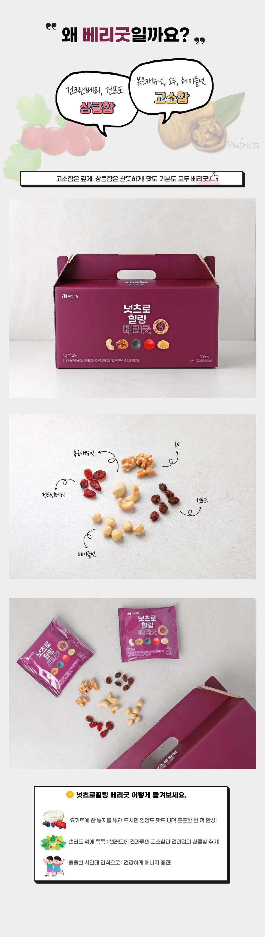 | 볶은캐슈넛, 호두, 헤이즐넛에 건크랜베리와 건포도를 더해, 고소함과 상큼함을 한번에! | ||||