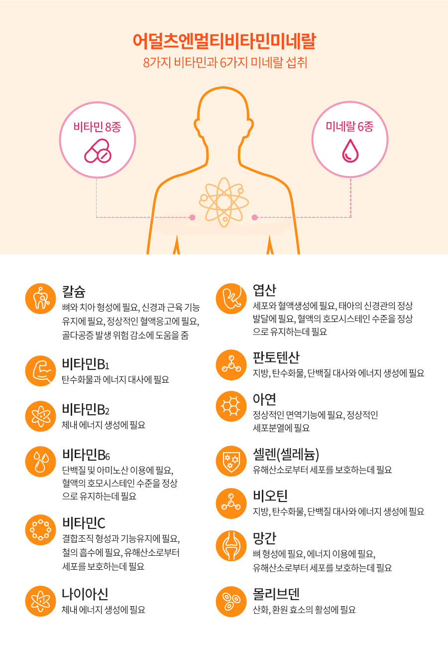 | 식품의 유형 | 건강기능식품/멀티비타민미네랄 | | 생산자 및 소재지, 수입품의 경우 수입자를 함께 표기 | (주)다움 / 경남 사천시 송포공단길 81-10 | | 제조연월일, 소비기한 또는 품질유지기한 | 제조일로부터 24개월 상품 발송일을 기준으로 소비기한의 1/3 이상 남은 상품만을 판매 | | 포장단위별 용량(중량), 수량 | 72 g(600 mg x 120정) / 30일분 | | 원재료명 및 함량(농수산물의 원산지 표시에 관한 법률에 따른 원산지 표시 포함) | 건조효모(비타민B1, 비타민B2, 비타민B6, 비오틴, 엽산, 나이아신, 판토텐산, 셀렌(셀레늄), 크롬, 아연/에스토니아산), 해조칼슘(칼슘32%/프랑스산), 인디안구스베리추출물분말(비타민C 50%/인도산), 건조효모(망간5%), 건조효모(몰리브덴0.2%), 귀리식이섬유, 동결건조채소곡물과일혼합분말(찹쌀현미, 보리, 밀, 쌀, 미강, 백태:대두, 우엉, 연근, 당근, 감자, 고구마, 호박, 무, 야콘, 보리순, 케일, 신선초, 브로콜리, 양배추, 매실, 딸기/국산), 두나리엘라 밀, 대두 함유 | | 영양정보 | 1일 섭취량 : 4정(2,400 mg) 1일 섭취량당 함량 : 열량 5 kcal, 탄수화물 1 g미만(0%), 단백질 0 g(0%), 지방 0 g(0%), 나트륨 0 mg(0%), 칼슘 240 mg(34%), 비타민B1 1.15 mg(96%), 비타민B2 1.4 mg(100%), 비타민B6 2 mg(133%), 비오틴 135 ㎍(450%), 엽산 765 ㎍DFE(191%), 나이아신 14 mgNE(93%), 판토텐산 5 mg(100%), 셀렌(셀레늄) 90 ㎍(164%), 아연 10 mg(118%), 비타민C 60 mg(60%), 망간 1.25 mg(42%), 몰리브덴 14.52 ㎍(58%), 크롬 90 ㎍(300%) *( )안의 수치는 1일 영양성분 기준치에 대한 비율 | | 기능정보 | 칼슘 : 뼈와 치아 형성에 필요, 신경과 근육 기능 유지에 필요, 정상적인 혈액응고에 필요, 골다공증 발생 위험 감소에 도움을 줌 비타민B1 : 탄수화물과 에너지 대사에 필요 비타민B2 : 체내 에너지 생성에 필요 비타민B6 : 단백질 및 아미노산 이용에 필요, 혈액의 호모시스테인 수준을 정상으로 유지하는데 필요 나이아신 : 체내 에너지 생성에 필요 엽산 : 세포와 혈액생성에 필요, 태아의 신경관의 정상 발달에 필요, 혈액의 호모시스테인 수준을 정상으로 유지하는데 필요 판토텐산 : 지방, 탄수화물, 단백질 대사와 에너지 생성에 필요 아연 : 정상적인 면역기능에 필요, 정상적인 세포분열에 필요 셀렌(셀레늄) : 유해산소로부터 세포를 보호하는데 필요 비오틴 : 지방, 탄수화물, 단백질 대사와 에너지 생성에 필요 비타민C : 결합조직 형성과 기능유지에 필요, 철의 흡수에 필요, 항산화 작용을 하여 유해산소로부터 세포를 보호하는데 필요 망간 : 뼈 형성에 필요, 에너지 이용에 필요, 유해산소로부터 세포를 보호하는데 필요 몰리브덴 : 산화, 환원 효소의 활성에 필요 크롬 : 체내 탄수화물, 지방, 단백질 대사에 관여 | | 섭취량, 섭취방법 및 섭취 시 주의사항 | 1일 2회, 1회 2정씩 물과 함께 섭취하십시오. (가) 이상사례 발생시 섭취를 중단하고 전문가와 상담하십시오. (나) 당뇨병이 있는 경우 섭취 전 전문가와 상담하십시오. 5세 이하 어린이는 섭취하지 마십시오. 알레르기 체질이신 분은 성분을 확인한 후 섭취하시기 바랍니다. 어린이의 경우 목에 걸릴 우려가 있으니 보호자의 지도하에 섭취하십시오. 섭취량 및 섭취방법을 준수하시고 기타사항은 소비자상담실로 문의하십시오. 임신, 수유부나 의약품을 섭취하시는 분은 섭취 전 전문가와 상담하여 주십시오. | | 질병의 예방 및 치료를 위한 의약품이 아니라는 내용의 표현 | 본 제품은 질병의 예방 및 치료를 위한 의약품이 아닙니다. 건강기능식품은 인체에 유용한 기능성을 가진 원료나 성분을 사용하여 제조가공한 식품입니다. | | 유전자재조합식품에 해당하는 경우의 표시 | 해당사항 없음 | | 표시광고 사전심의필 | 본 광고물은 기능성 표시 · 광고 심의위원회의 심의를 받았습니다. | | 수입식품에 해당하는 경우 “건강기능식품에 관한 법률에 따른 수입신고를 필함”의 문구 | 해당사항 없음 | | 포장재질 | 용기(HDPE), 뚜껑(PP), 완충비닐(PE) 종이박스(4.8×4.8×10.3 cm) | | 보관방법 및 취급방법 | 고온 다습한 곳과 직사광선을 피하여 습기가 적고 건조한 곳에 보관하십시오. 개봉 후에는 뚜껑을 닫고 공기의 노출을 최대한 차단하여 보관하십시오. 영유아 및 어린이의 손에 닿지 않는 곳에 보관하십시오. 유통 과정 중 이상이 있는 제품은 구입처에서 교환해드립니다. | | 주의사항 | 뚜껑 내 방습제(실리카겔)는 절대 섭취하지 마십시오. 본 제품은 식약처에서 고지한 알레르기 유발성분(계란, 우유, 메밀, 땅콩, 고등어, 게, 새우, 돼지고기, 복숭아, 토마토, 호두, 닭고기, 쇠고기, 오징어, 조개류)을 사용하는 제품과 동일한 제조시설(작업자, 기구, 제조라인, 원료보관 등 모든 과정)에서 생산되고 있습니다. 부작용 추정사례 신고는 국번없이 1577-2488 | | A/S 책임자와 전화번호 | 상담팀 1577-6009 |