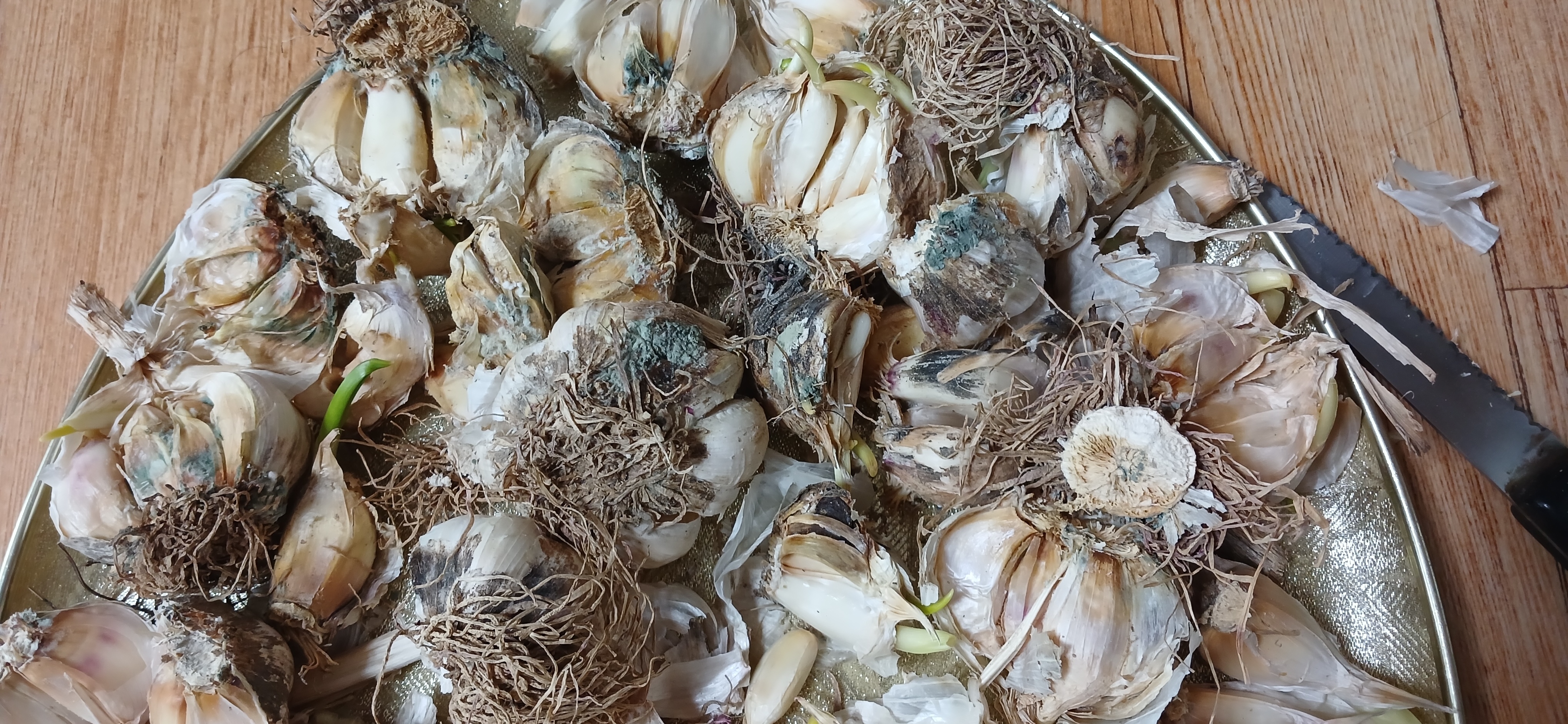 마늘을 어떻게 보관하다 판매하시는지 모든 마늘에 파란 싹이 나 있네요. 군데군데 곰팡이도 피었고요.